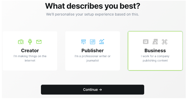 次は、自分の立場の選択です。デザイナーなのか、ライターなのか、マーケティング担当なのか、この選択によって、この後の管理画面のUIや項目がパーソナライズされます。